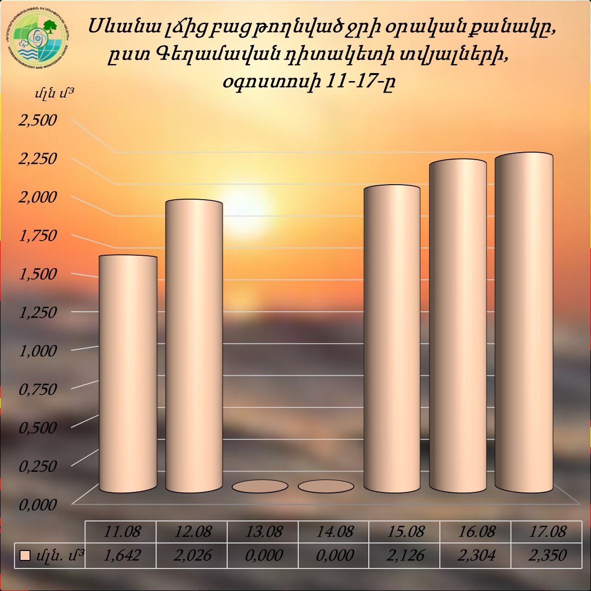 Սևանա լճից բացթողնված ջրի ծավալը ըստ Հրազդան ՀԷԿ-ի ուղղաթեք ջրանցքի Գեղամավան դիտակետի օգոստոսի 11-17-ը ներառյալ ընկած ժամանակահատվածում կազմել է 10.448 մլն.մ3, իսկ ընդհանուր գումարային բացթողումը՝ հունիսի 6-ից օգոստոսի 17-ը ներառյալ՝ 132.178 մլն.մ3: