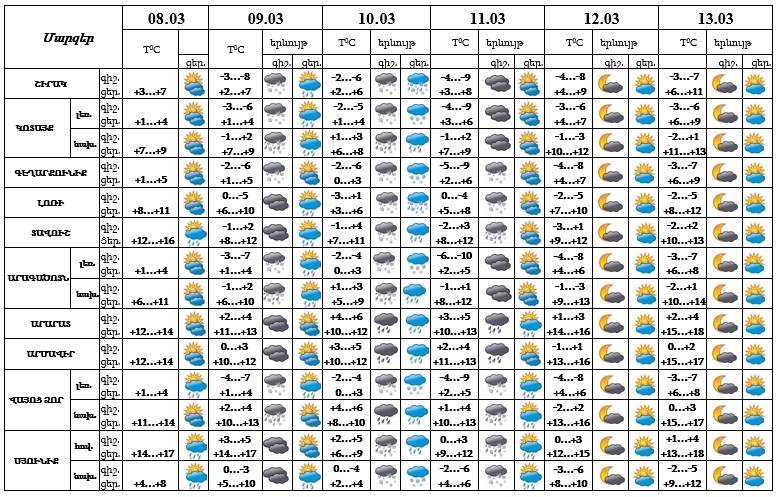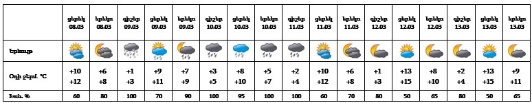 Մարտի 8-ի ցերեկը, 9-ին և 11-ին առանձին շրջաններում, 10-ին շրջանների զգալի մասում սպասվում են տեղումներ, լեռնային շրջաններում՝ ձյան և թաց ձյան տեսքով։ Մարտի 12-13-ին սպասվում է առանց տեղումների եղանակ։ Քամին՝ արևմտյան 2-6 մ/վ, մարտի 8-ի ցերեկը, 9-ին առանձին շրջաններում սպասվում է քամու ուժգնացում՝ 15-18մ/վրկ արագությամբ: Օդի ջերմաստիճանն մարտի 12-13-ին կբարձրանա 5-6 աստիճանով։