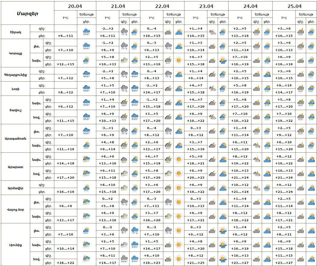 Ապրիլի 20-ի ցերեկը, 21-ին շրջանների զգալի մասում, 22-ի գիշերը, 23-ի ցերեկը, 24-25-ին առանձին շրջաններում սպասվում է անձրև, առանձին հատվածներում՝ ամպրոպ։ Ապրիլի 20-ի ցերեկը, 21-ին առանձին շրջաններում տեղումները կլինեն ինտենսիվ։ Ապրիլի 21-22-ին տեղումները լեռնային շրջաններում գիշերը և առավոտյան ժամերին կլինեն թաց ձյան տեսքով։ Ապրիլի 22-ի ցերեկը, 23-ի գիշերը սպասվում է առանց տեղումների եղանակ։