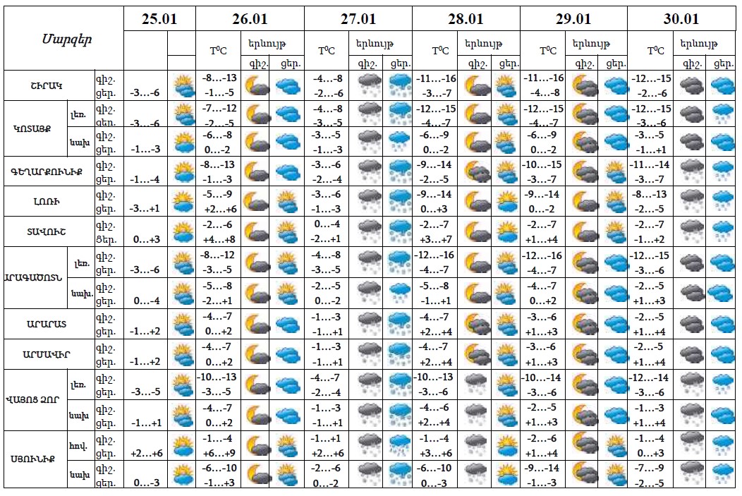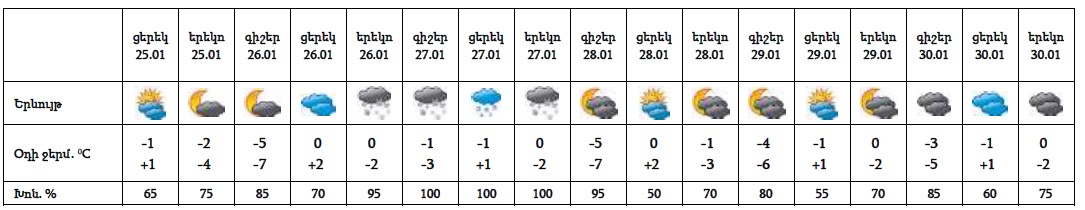 Հունվարի 25-ի ցերեկը, 26-ի գիշերը, 28-30-ին սպասվում է առանց տեղումների եղանակ։ Հունվարի 26-ի ուշ երեկոյան, 27-ին սպասվում է ձյուն։