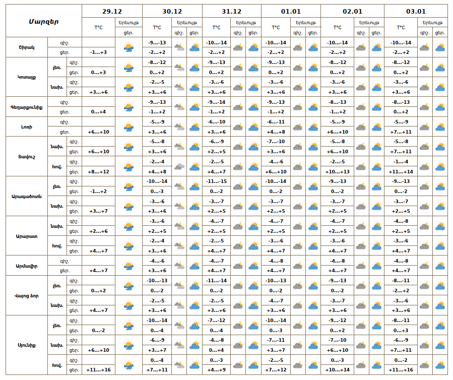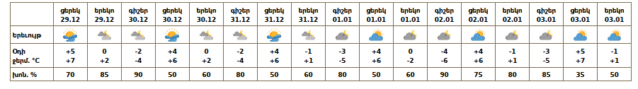 Դեկտեմբերի 29-ի ցերեկը, 30-31-ին, հունվարի 1-3-ին սպասվում է առանց տեղումների եղանակ։ Ցածրադիր գոտում առավոտյան ժամերին սպասվում է մառախուղ։