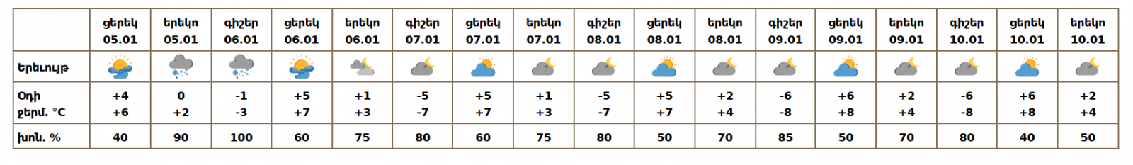 Հունվարի 5-ի ուշ երեկոյան և 6-ի գիշերը սպասվում է ձյուն։ Հունվարի 6-ի ցերեկը, 7-10-ին սպասվում է առանց տեղումների եղանակ: