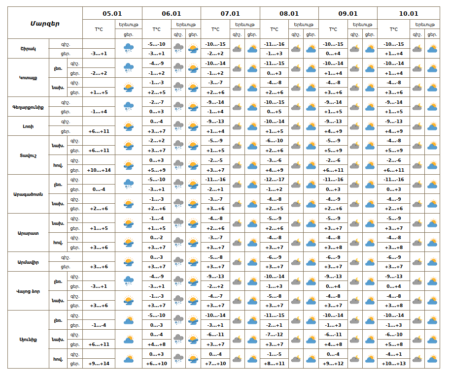 Հունվարի 5-ի ուշ երեկոյան առանձին շրջաններում, առաջիկա գիշերը և առավոտյան հանրապետության ողջ տարածքում սպասվում է ձյուն, լեռնային առանձին շրջաններում նաև բուք, ճանապարհներին մերկասառույց։ Հունվարի 6-ի ցերեկը, 7-10-ին սպասվում է առանց տեղումների եղանակ: Քամին հյուսիսարևմտյան 2-4մ/վ։ Օդի ջերմաստիճանը հունվարի 6-ի գիշերը կբարձրանա՝ 6-8 աստիճանով, 7-8-ի գիշերը կնվազի`7-10 աստիճանով։