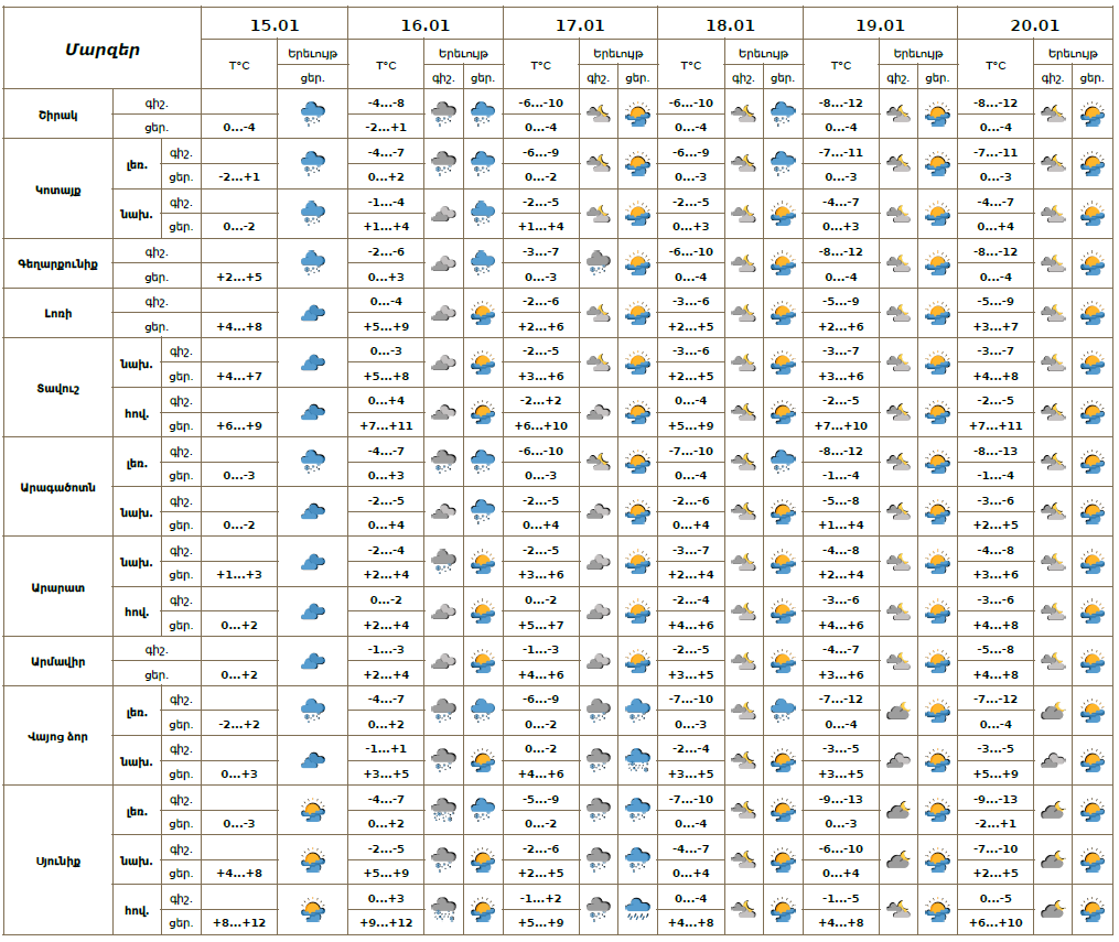 Հունվարի 15-ի ցերեկը, 16-18-ին առանձին շրջաններում սպասվում է թույլ ձյուն։ Հունվարի 19-20-ին սպասվում է առանց տեղումների եղանակ։ Հունվարի 15-ին Շիրակում, Արագածոտնում և Կոտայքում սպասվում է մառախուղ, ճանապարհներին` մերկասառույց։