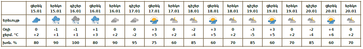 Հունվարի 15-ի ցերեկը, 16-ին հնարավոր են թույլ և կարճատև տեղումներ։ Հունվարի 17-19-ին սպասվում է առանց տեղումների եղանակ: