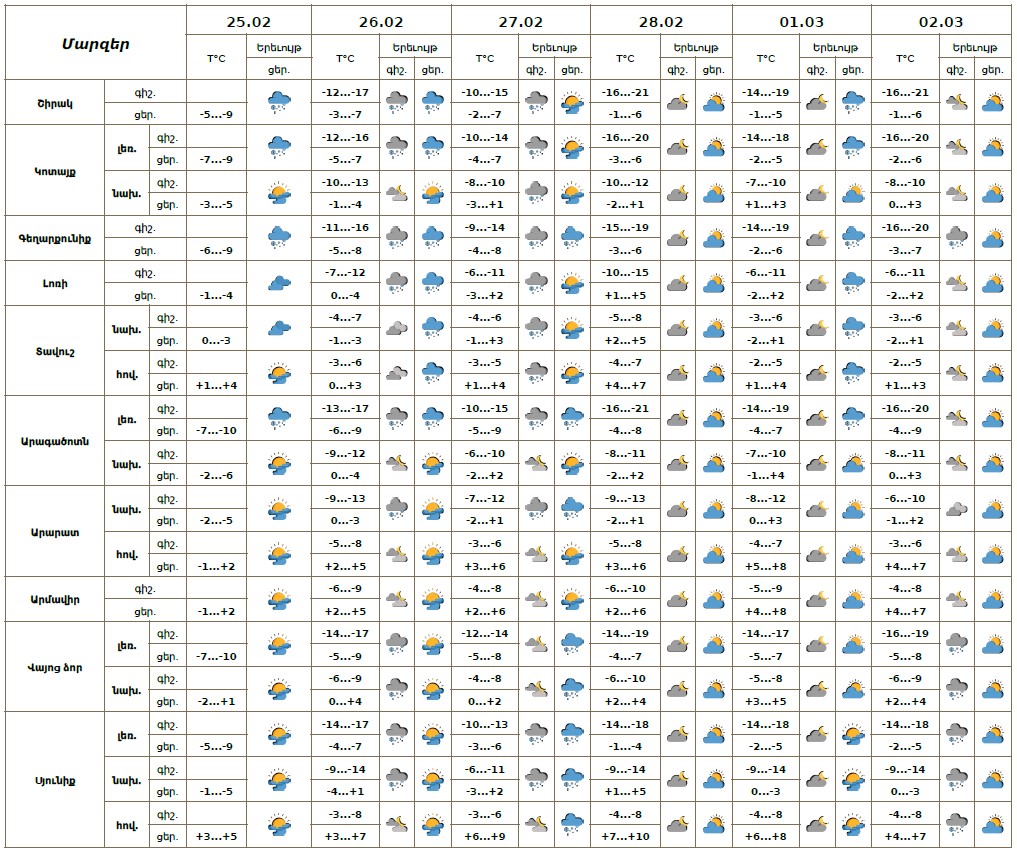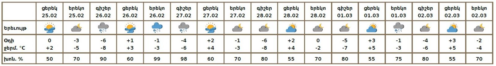 Փետրվարի 25-ի ցերեկը, 28-ին, մարտի 1-ի գիշերը, 2-ին սպասվում է առանց տեղումների եղանակ։ Փետրվարի 26-ի գիշերը և երեկոյան, 27-ի գիշերը, մարտի 1-ի երեկոյան սպասվում է թույլ ձյուն։