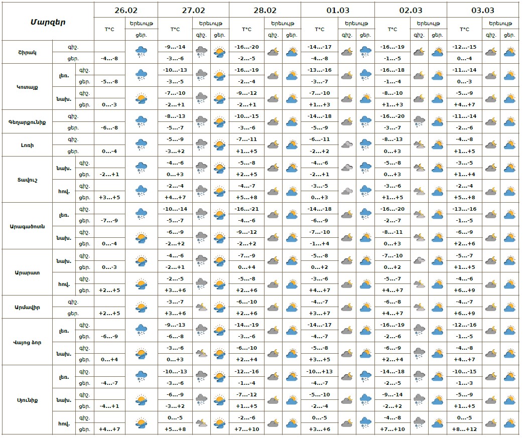 Փետրվարի 26-ի ցերեկը, 27-ի գիշերը և առավոտյան, մարտի 1-ի ցերեկը, 2-ի գիշերն առանձին շրջաններում սպասվում է ձյուն: Փետրվարի 28-ին, մարտի 1-ի գիշերը, 2-ի ցերեկը, 3-ին սպասվում է առանց տեղումների եղանակ։