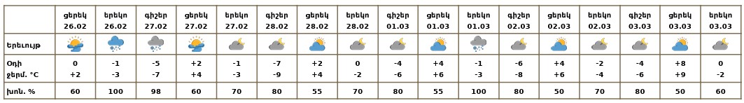 Փետրվարի 26-ի երեկոյան, 27-ի գիշերը և առավոտյան, մարտի 1-ի երեկոյան սպասվում է թույլ ձյուն։ Փետրվարի 28-ին, մարտի 1-ի գիշերը, 2-3-ին սպասվում է առանց տեղումների եղանակ։