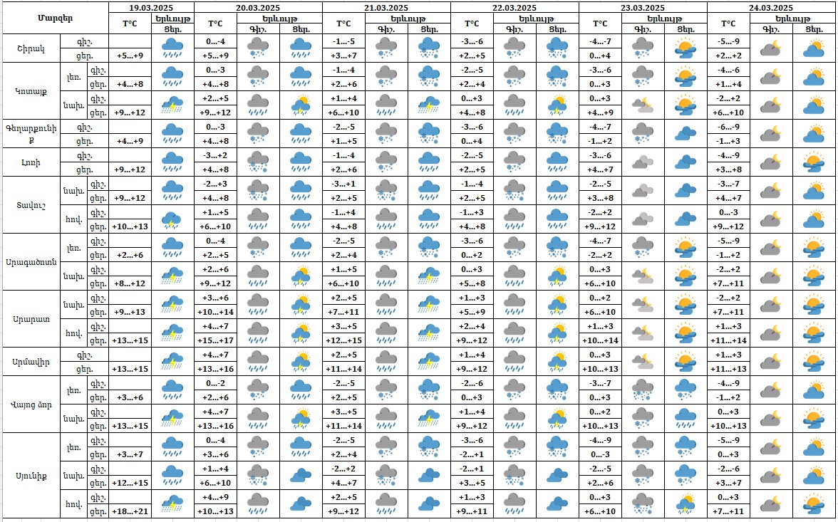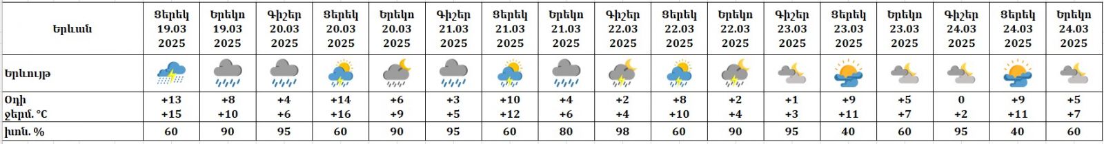 Մարտի 19-ի ցերեկը, 20-22-ին սպասվում է անձրև, հնարավոր է ամպրոպ։ Մարտի 23-24-ին սպասվում է առանց տեղումների եղանակ։