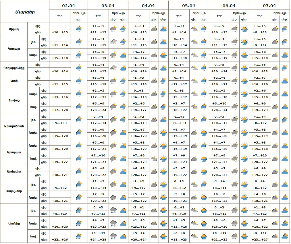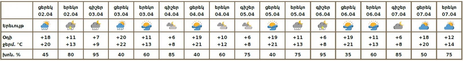 Ապրիլի 2-ի ցերեկը շրջանների մեծ մասում, 3-7-ին` առանձին շրջաններում օրվա ընթացքում սպասվում է կարճատև անձրև, հնարավոր է նաև նաև ամպրոպ։