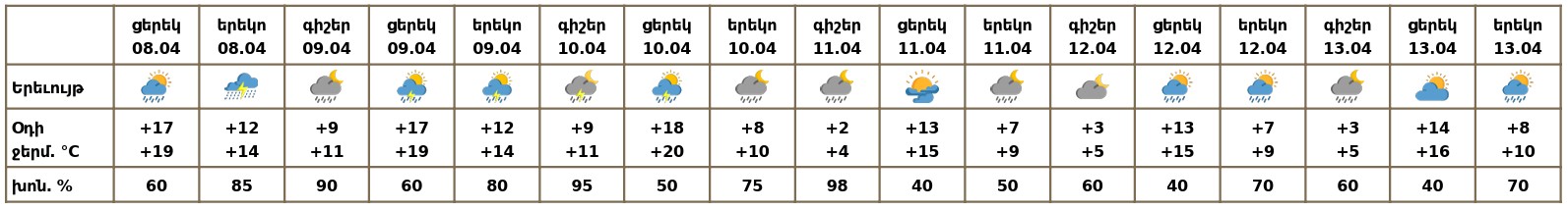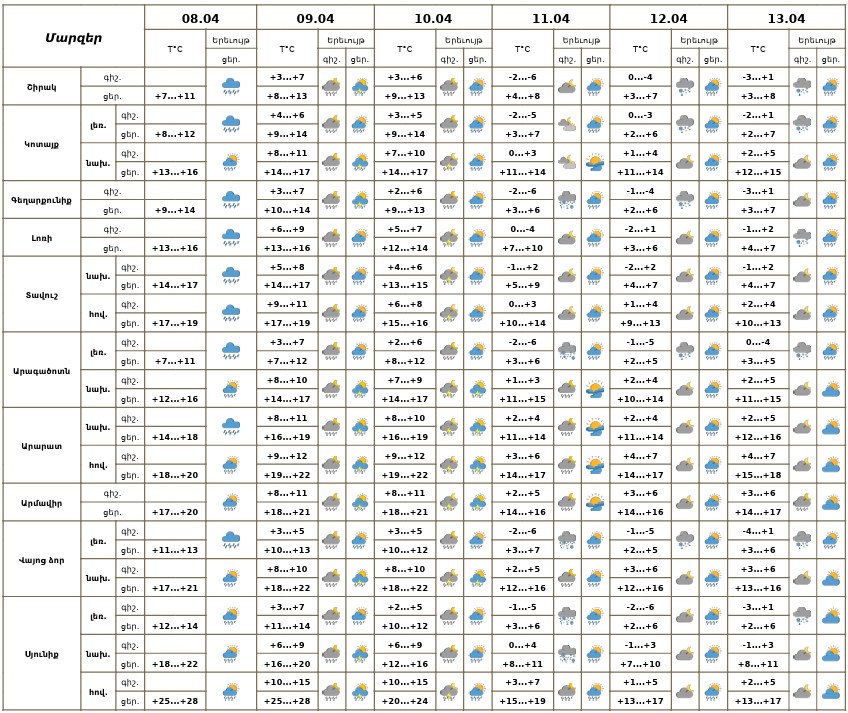 Ապրիլի 8-ի ցերեկը, 9-13-ին սպասվում է կարճատև անձրև, հնարավոր է նաև ամպրոպ։ Ապրիլի 9-10-ին սպասվում է քամու ուժգնացում՝ 13-15մ/վ արագությամբ։