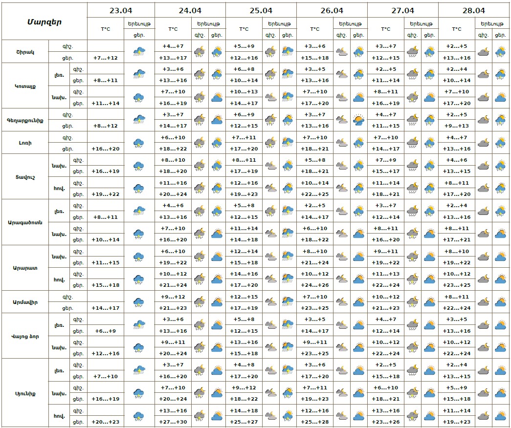 Ապրիլի 23-ի ցերեկը, 24-ի գիշերը, 25-ին, 27-ի գիշերը շրջանների զգալի մասում, 24-ի ցերեկը, 26-ի և 27-ի ցերեկը, 28-ին առանձին շրջաններում սպասվում է անձրև և ամպրոպ, 23-ին և 25-ին առանձին վայրերում՝ հորդառատ։