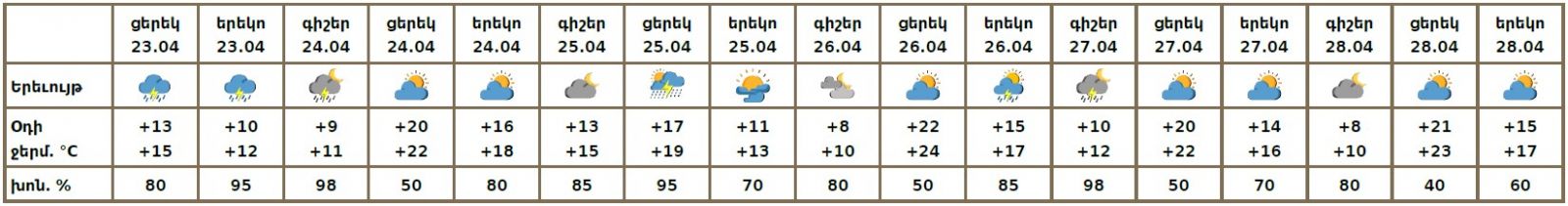 Ապրիլի 23-ի ցերեկը, 24-ի գիշերը և առավոտյան, 25-ին, 26-ի երեկոյան, 27-ի գիշերը սպասվում է անձրև և ամպրոպ, ամպրոպի ժամանակ՝ քամու ուժգնացում 17-20 մ/վ արագությամբ: Ապրիլի 24-ի, 26-ի և 27-ի ցերեկը, 28-ին սպասվում է առանց տեղումների եղանակ։
