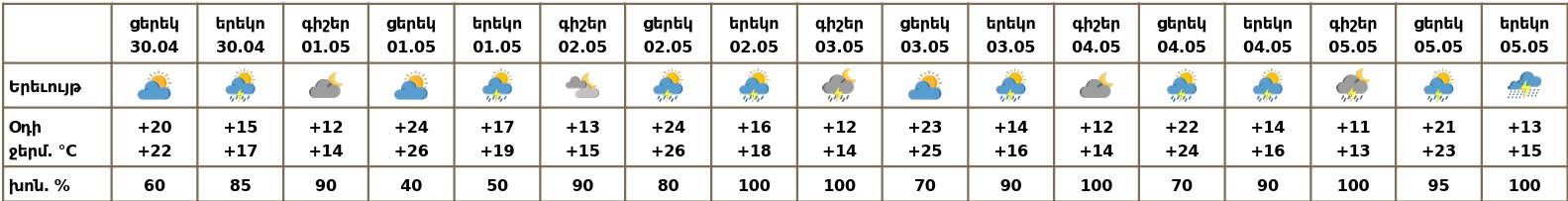 Ապրիլի 30-ին կեսօրից հետո, մայիսի 1-ին երեկոյան, մայիսի 2-5-ին սպասվում է կարճատև անձրև և ամպրոպ, ամպրոպի ժամանակ՝ քամու ուժգնացում 15-18 մ/վ արագությամբ: