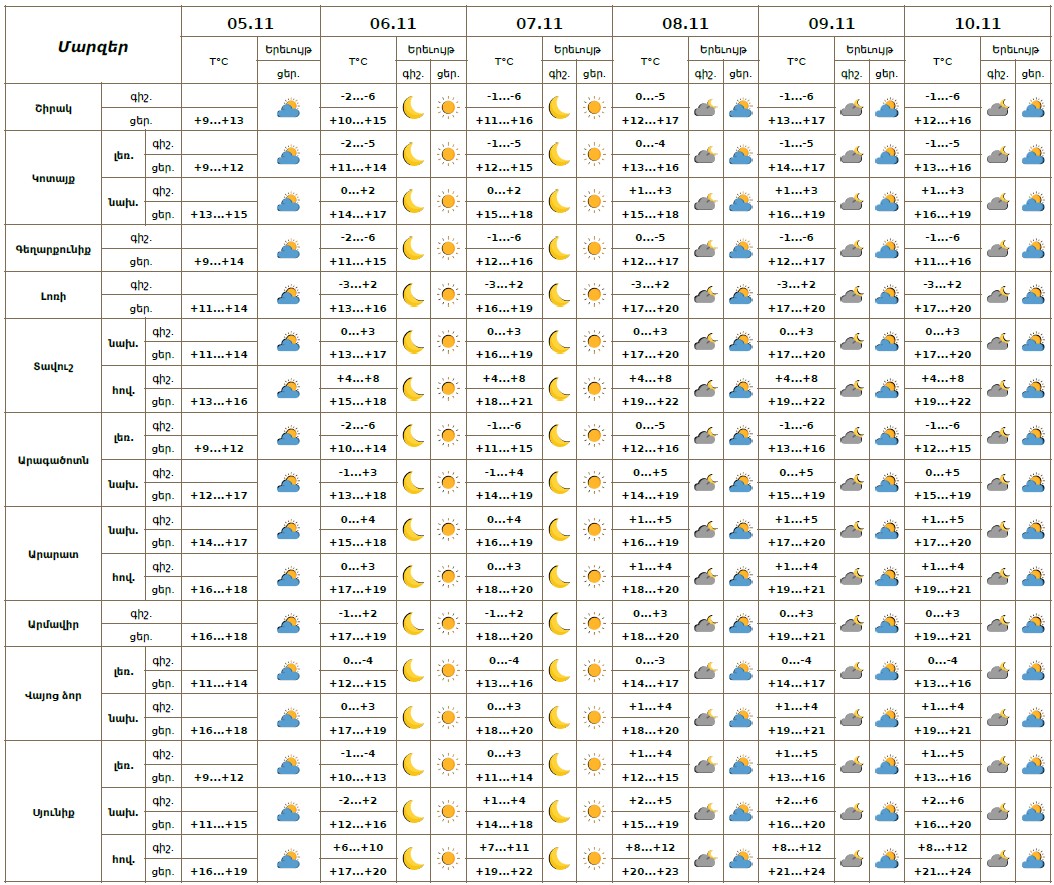 Նոյեմբերի 5-ի ցերեկը, նոյեմբերի 6-10-ին սպասվում է առանց տեղումների եղանակ։