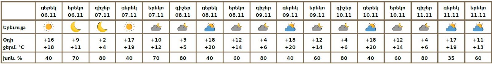 Նոյեմբերի 6-ի ցերեկը, 7-11-ին սպասվում է առանց տեղումների եղանակ: Քամին հարավարևմտյան՝ 2-5մ/վ: Օդի ջերմաստիճանը նոյեմբերի 7-9-ին աստիճանաբար կբարձրանա 2-4 աստիճանով։