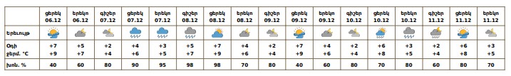 Դեկտեմբերի 6-ի ցերեկը, 7-ի գիշերը, 8-ի ցերեկը, 9-ին սպասվում է առանց տեղումների եղանակ։ Դեկտեմբերի 7-ի ցերեկը, 8-ին, 10-ի ցերեկը, 11-ի գիշերը սպասվում է անձրև։