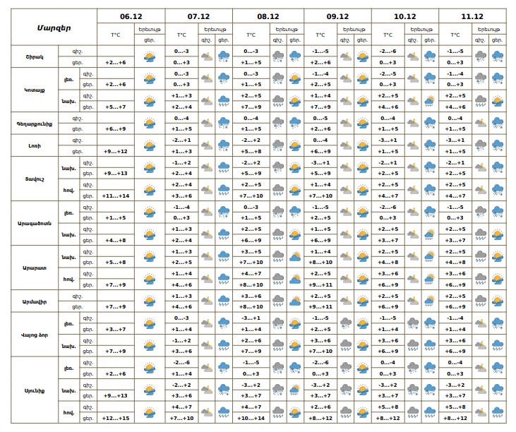 Դեկտեմբերի 6-ի ցերեկը, 7-ի գիշերը, 9-ի ցերեկը սպասվում է առանց տեղումների եղանակ։ Դեկտեմբերի 7-ի ցրեկը, 8-ի գիշերը շրջանների զգալի մասում, 8-ի ցերեը, 9-ի գիշերը, 10-11-ին առանձին շրջաններում սպասվում են տեղումներ՝ լեռնային և առանձին նախալեռնային շրջաններում ձյան և ձնախառն անձրևի, հովտային շրջաններում՝ անձրևի տեսքով: Դեկտեմբերի 7-ի ցերեկը և 8-ի գիշերը առանձին հատվածներում տեղումները կլինեն առատ։ Դեկտեմբերի 6-9-ին Արարատյան և Շիրակի դաշտի ցածրադիր հատվածներում առավոտյան ժամերին սպասվում է մառախուղ։ Քամին արևմտյան՝ 2-5մ/վ, դեկտեմբերի 6-ին առանձին շրջաններում սպասվում է քամու ուժգնացում՝ 13-16 մ/վ արագությամբ։ Օդի ջերմաստիճանը դեկտեմբերի 7-ի ցերեկը կնվազի 2-3, Լոռիում, Տավուշում, Սյունիքում՝ 5-7 աստիճանով, դեկտեմբերի 8-9-ի ցերեկն աստիճանաբար կբարձրանա 3-4 աստիճանով: