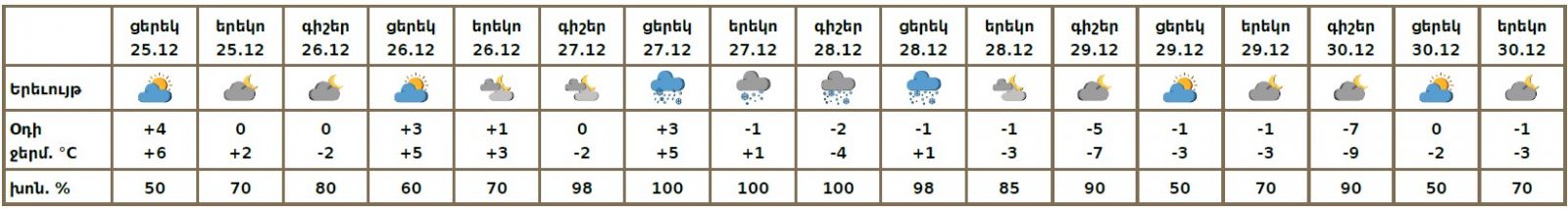 Դեկտեմբերի 25-ի ցերեկը, 29-ի գիշերը, 30-ին սպասվում է առանց տեղումների եղանակ։ Դեկտեմբերի 26-ին, 27-ի գիշերը, 29-ի ցերեկն առանձին շրջաններում, 27-ի կեսօրից հետո, 28-ին շրջանների մեծ մասում սպասվում են տեղումներ, 27-ին լեռնային և նախալեռնային գոտում, 28-ին ողջ հանրապետությունում ձյան տեսքով։