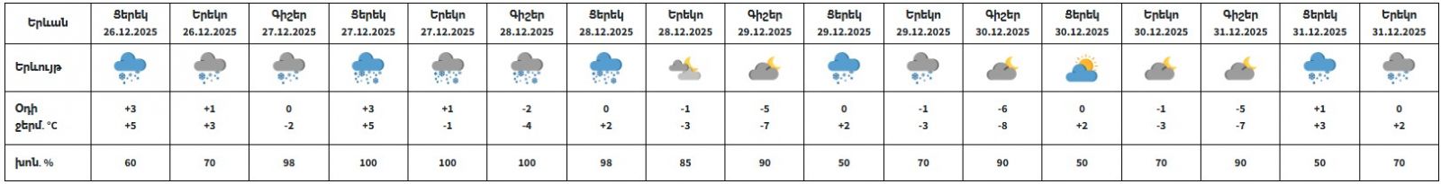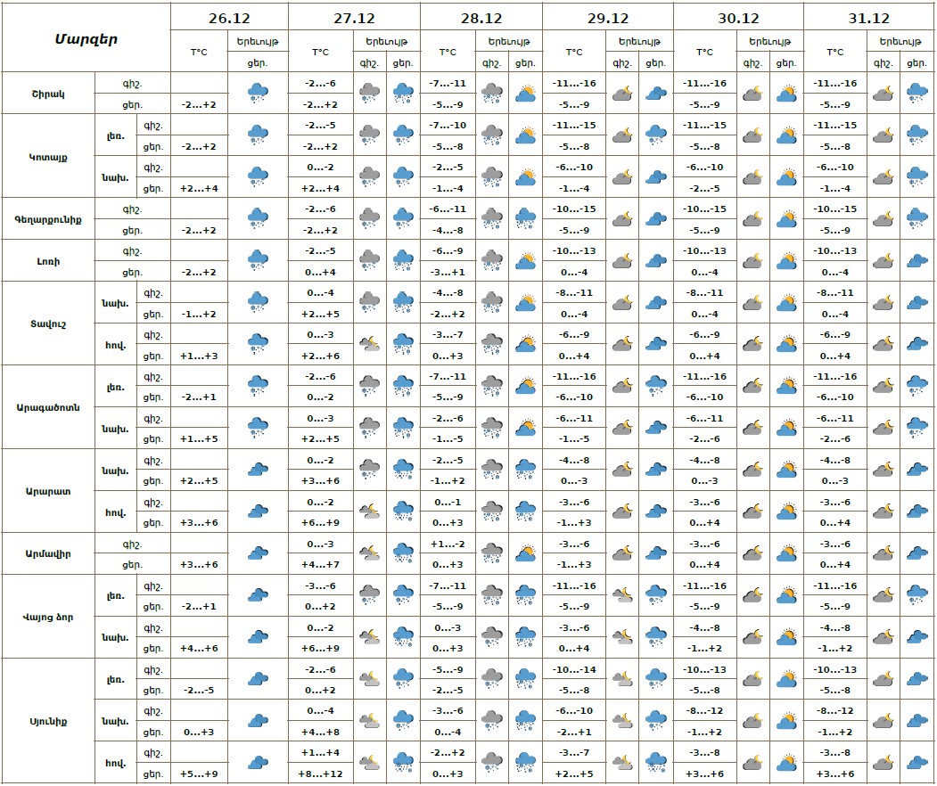 Հյուսիս-արևմուտքից ցուրտ մթնոլորտային ճակատի ներթափանցմամբ պայմանավորված` դեկտեմբրի 26-ին, դեկտեմբերի 27-ի գիշերը առանձին շրջաններում կտեղա թույլ ձյուն։ Դեկտեմբերի 27-ի կեսօրից հետո դեպի երեկո և դեկտեմբերի 27-ին լույս 28-ի գիշերը ու առավոտյան հանրապետության ողջ տարածքում, դեկտեմբերի 28-ի ցերեկը Գեղարքունիքում, Արարատում, Վայոց ձորում ու Սյունիքում սպասվում է ձյուն, առանձին հատվածներում՝ առատ։ Հանրապետության լեռնային մարզերի առանձին գոտիներում սպասվում է նաև քամու ուժգնացում 17-20մ/վրկ, բուք, ցածր հորիզոնական տեսանելիություն։ Օդի ջերմաստիճանը դեկտեմբերի 28- 30-ին հանրապետության ողջ տարածքում կնվազի 5-7 աստիճանով։ Երևանում դեկտեմբերի 26-ի ցերեկը, 27-ի գիշերը սպասվում են թույլ տեղումներ։ Դեկտեմբերի 27-ի ուշ երեկոյան, դեկտեմբերի 27-ի լույս 28-ի գիշերը և առավոտյան սպասվում է ձյուն։