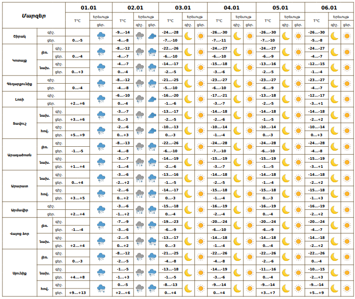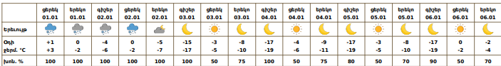 Հունվարի 1-ի ցերեկը, 2-ի գիշերը և առավոտյան հանրապետության շրջանների մեծ մասում, հունվարի 2-ի ցերեկը՝ Վայոց ձորում և Սյունիքում սպասվում է ձյուն, առանձին հատվածներում՝ զգալի։Հունվարի 3-6-ին սպասվում է առանց տեղումների եղանակ։ Քամին հյուսիսարևմտյան՝ 2-5մ/վ, հունվարի 1-ցերեկը, 2-ին լեռնային մարզերի առանձին գոտիներում սպասվում է նաև քամու ուժգնացում՝ 17-20մ/վրկ, բուք, ցածր հորիզոնական տեսանելիություն։ Օդի ջերմաստիճանը հունվարի 3-4-ին հանրապետության ողջ տարածքում գիշերը կնվազի 14-18 աստիճանով։