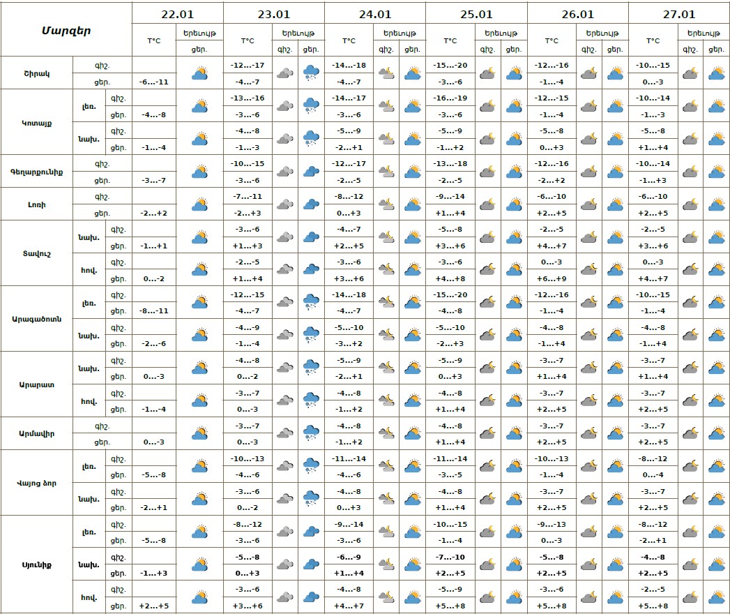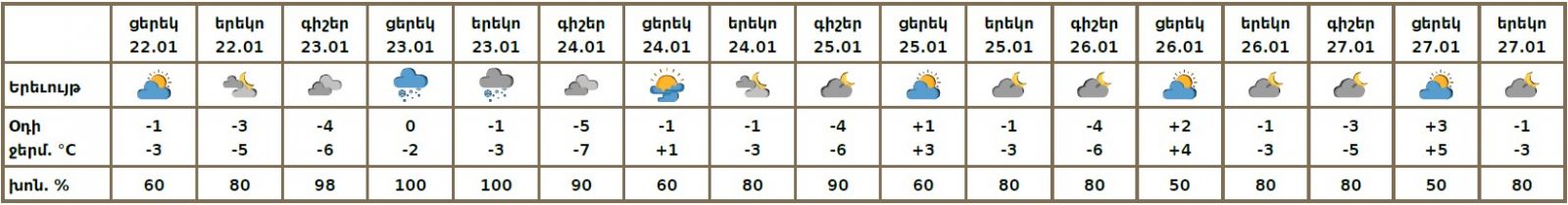 Հունվարի 22-ի ցերեկը, 24-27-ին սպասվում է առանց տեղումների եղանակ: Հունվարի 23-ի առավոտյան ժամերին և ցերեկը սպասվում է ձյուն: