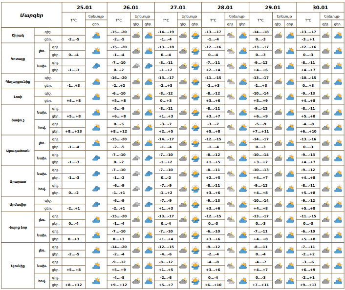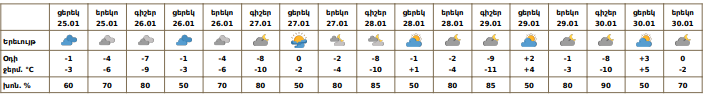 Հունվարի 25-ի ցերեկը, 26-30-ին սպասվում է առանց տեղումների եղանակ։ Քամին` հարավարևմտյան` 2-5մ/վ: Հունվարի 25-ի ցերեկը, 26-ին Շիրակի դաշտի ցածրադիր հատվածներում, Արագածոտնի նախալեռներում, Արարատյան դաշտում, այդ թվում նաև Երևանում սպասվում է մառախուղ։ Օդի ջերմաստիճանն էապես չի փոխվի:
