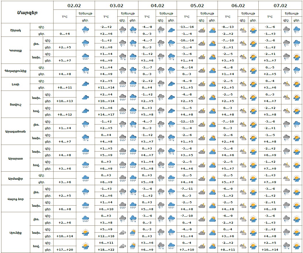 Փետրվարի 2-ի ցերեկը, 3-4-ին, 7-ին առանձին շրջաններում սպասվում են տեղումներ, նախալեռնային և հովտային շրջաններում՝ ձնախառն անձրևի և անձրևի, լեռնային շրջաններում ձյան տեսքով, լեռնային առանձին շրջաններում՝ բուք, ցածր հորիզոնական տեսանելիություն։ Փետրվարի 5-6-ին սպավում է առանց տեղումների եղանակ։