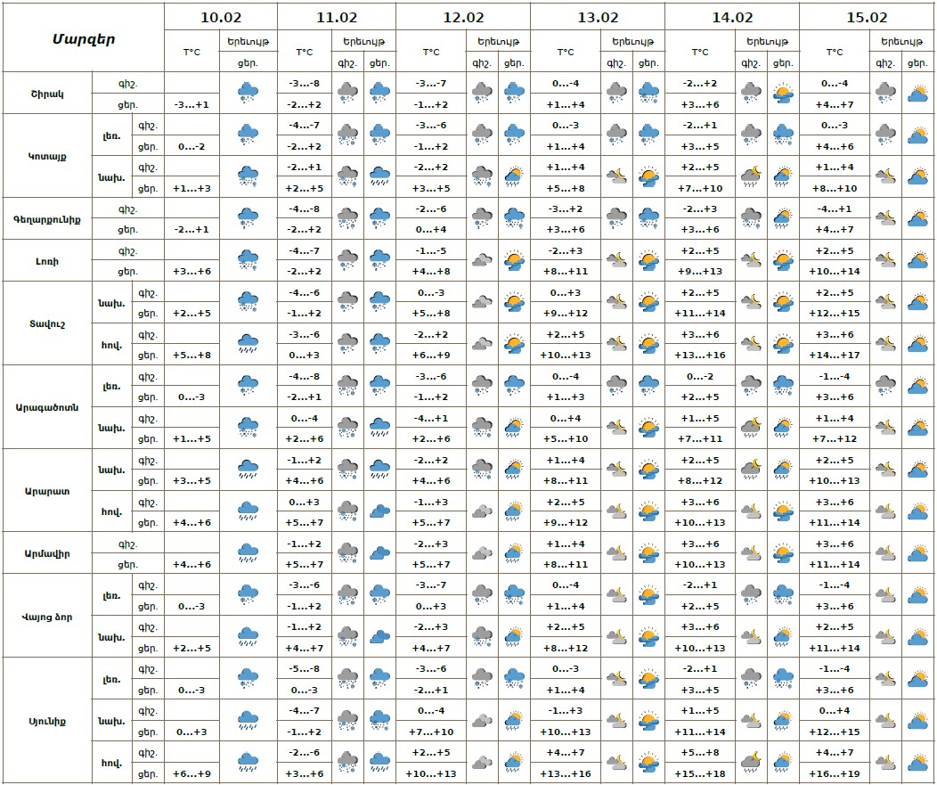 Օդի ջերմաստիճանը փետրվարի 10-ի ցերեկը կնվազի ևս 2-3, Լոռիում, Տավուշում և Սյունիքում՝ 4-6 աստիճանով, փետրվարի 12-15-ին ողջ հանրապետությունում աստիճանաբար կբարձրանա 6-9 աստիճանով։