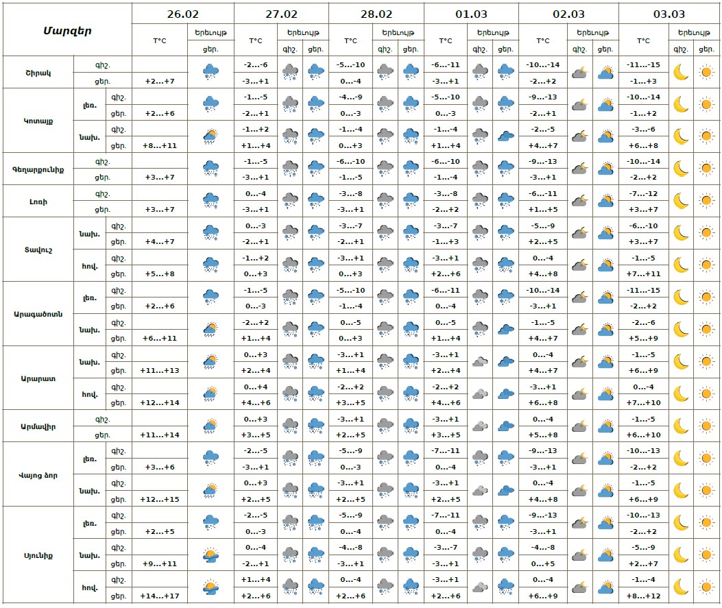Փետրվարի 26-ի ցերեկն առանձին շրջաններում սպասվում են տեղումներ՝ նախալեռնային և հովտային շրջաններում՝ անձրևի, լեռնային շրջաններում՝ ձյան և ձնախառն անձրևի տեսքով։ Փետրվարի 26-ի ուշ երեկոյան, 27-28-ին շրջանների մեծ մասում, մարտի 1-ին առանձին շրջաններում սպասվում են տեղումներ, լեռնային շրջաններում՝ բուք, ցածր հորիզոնական տեսանելիություն։ Փետրվարի 27-28-ին ողջ հանրապետությունում տեղումները կլինեն ձյան, առանձին հովտային շրջաններում՝ ձնախառն անձրևի տեսքով: Փետրվարի 27-ին առանձին վայրերում տեղումները կլինեն առատ։ Մարտի 2-3-ին սպասվում է առանց տեղումների եղանակ։ Քամին` հարավարևմտյան` 4-8 մ/վ, փետրվարի 26-ի ցերեկն առանձին վայրերում սպասվում է քամու ուժգնացում՝ 18- 23մ/վ արագությամբ։ Օդի ջերմաստիճանը փետրվարի 26-ի ցերեկը, 27-28-ին աստիճանաբար կնվազի 8-12 աստիճանով: