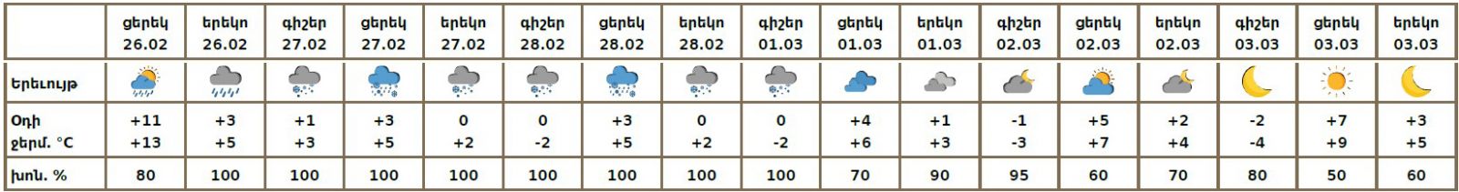 Փետրվարի 26-ի ցերեկը սպավում է անձրև։ Փետրվարի 27-28-ին, մարտի 1-ի գիշերը ժամանակ առ ժամանակ սպասվում են տեղումներ․ գիշերը՝ ձյան, ցերեկը՝ ձնախառն անձրևի տեսքով։ Մարտի 1-ի ցերեկը, 2-3-ին սպասվում է առանց տեղումների եղանակ։ Փետրվարի 26-ի ցերեկը սպասվում է քամու ուժգնացում՝ 18-23մ/վ արագությամբ։