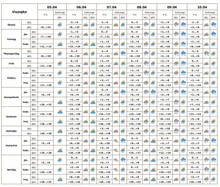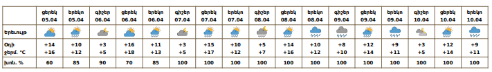 Ապրիլի 5-ին և 6-ին կեսօրից հետո հնարավոր է կարճատև անձրև։ Ապրիլի 7-10-ին ժամանակ առ ժամանակ սպասվում է անձրև։