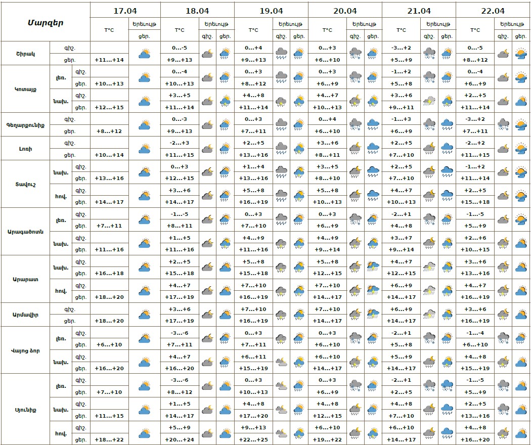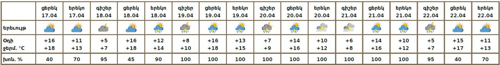 Ապրիլի 17-ի ցերեկը, 18-ի գիշերը և 22-ի ցերեկը սպասվում է առանց տեղումների եղանակ։ Ապրիլի 18-ին կեսօրից հետո հնարավոր է կարճատև անձրև։ Ապրիլի 19-21-ին ժամանակ առ ժամանակ, 22-ի գիշերը սպասվում է անձրև և ամպրոպ, ամպրոպի ժամանակ՝ քամու ուժգնացում մինչև 15-18մ/վ արագությամբ։