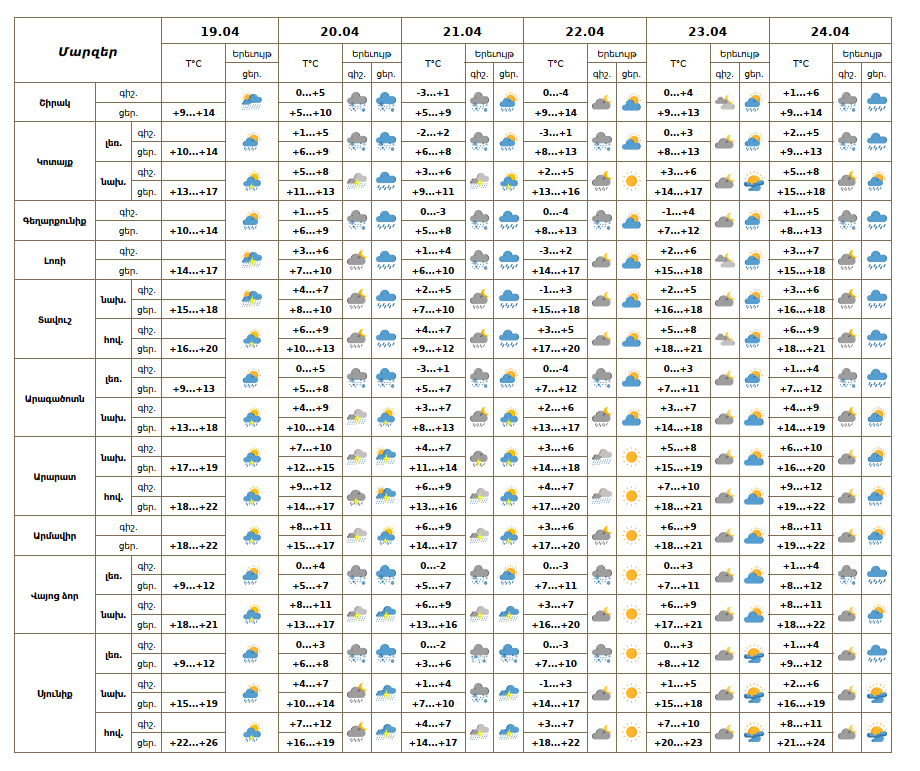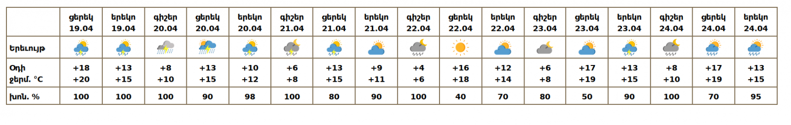 Ապրիլի 19-ի ցերեկը, 20-21-ին ժամանակ առ ժամանակ շրջանների զգալի մասում, 22-ի գիշերը, 23-ի ցերեկը, 24-ին առանձին շրջաններում սպասվում է անձրև, հնարավոր է ամպրոպ։ Ապրիլի 19-ի երեկոյան ժամերին, 20-21-ին, 22-ի գիշերն առանձին շրջաններում տեղումները կլինեն ինտենսիվ։ Ապրիլի 20-22-ին, 24-ին տեղումները լեռնային շրջաններում գիշերը և առավոտյան ժամերին կլինեն թաց ձյան տեսքով։ Ապրիլի 22-ի ցերեկը, 23-ի գիշերը սպասվում է առանց տեղումների եղանակ։ Քամին` հարավարևմտյան` 2-5 մ/վ, ամպրոպի ժամանակ սպասվում է նաև քամու ուժգնացում 16-19մ/վ արագությամբ: Օդի ջերմաստիճանն ապրիլի 20-ի ցերեկը կնվազի 4-6 աստիճանով, ապրիլի 22-24-ին ցերեկային ժամերին աստիճանաբար կբարձրանա 2-4 աստիճանով։