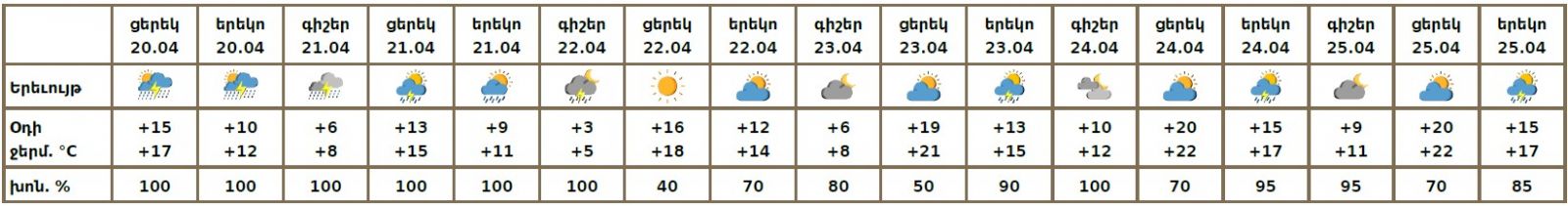 Ապրիլի 20-ի ցերեկը, 21-ին, 22-ի գիշերը, 23-25-ին կեսօրից հետո սպասվում է անձրև և ամպրոպ, ապրիլի 20-ին կեսօրից հետո, 21-ի գիշերը՝ ինտենսիվ։ Ամպրոպի ժամանակ՝ քամու ուժգնացում մինչև 15-18մ/վ արագությամբ։ Ապրիլի 22-ի ցերեկը, 23-25-ի գիշերային ժամերին սպասվում է առանց տեղումների եղանակ։