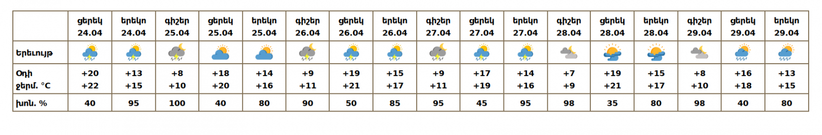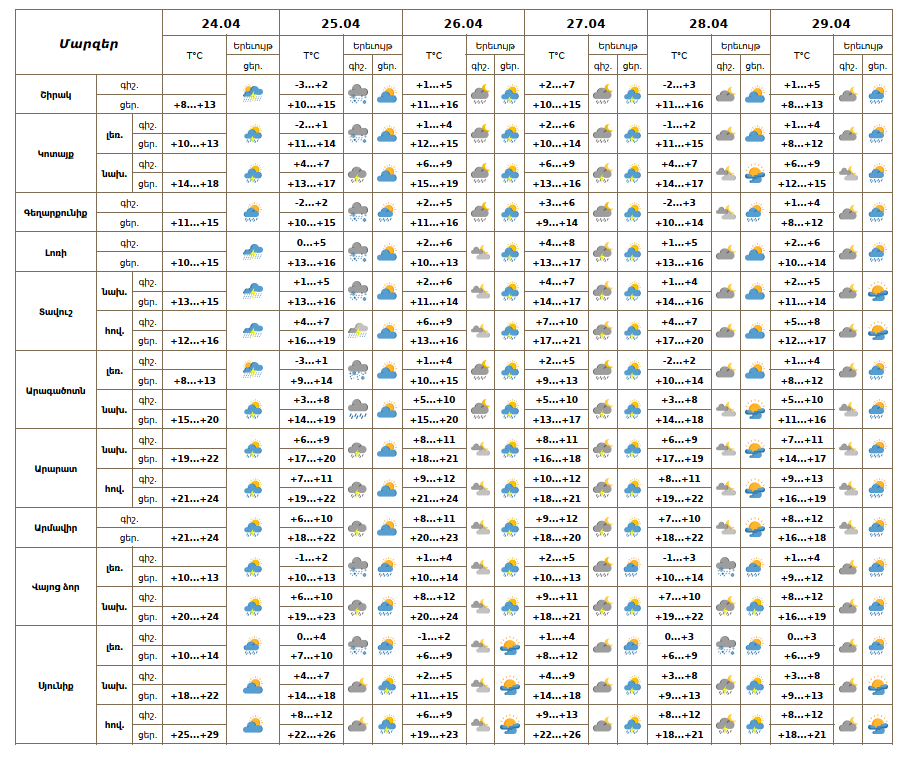 Ապրիլի 24-ի ցերեկը, 25-ի գիշերը և առավոտյան ժամերին 26-27-ին, 29-ին կեսօրից հետո սպասվում է անձրև և ամպրոպ, ամպրոպի ժամանակ՝ քամու ուժգնացում մինչև 16-19մ/վ արագությամբ։ Ապրիլի 25-ի ցերեկը, 28-ին և 29-ի գիշերը սպասվում է առանց տեղումների եղանակ։.png)