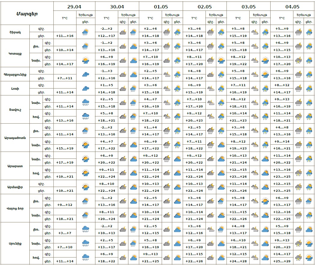 Օդի ջերմաստիճանն ապրիլի 29-ի ցերեկը կնվազի 2-3 աստիճանով, ապրիլի 30-ին և մայիսի 1-3-ին աստիճանաբար կբարձրանա 4-5, Լոռիում, Տավուշում և Սյունիքում 7-10 աստիճանով։