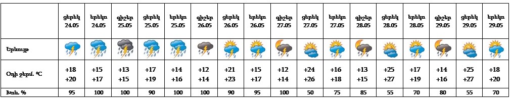 Մայիսի 24-ի ցերեկը, 25-26-ին ժամանակ առ ժամանակ սպասվում է անձրև և ամպրոպ, առանձին հատվածներում՝ ինտենսիվ, հնարավոր է կարկուտ։ Մայիսի 27-29-ին սպասվում է կարճատև անձրև և ամպրոպ, ամպրոպի ժամանակ՝ քամու ուժգնացում՝ 16-20մ/վ արագությամբ։