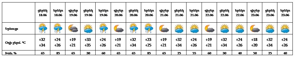 Հունիսի 18-ին և 20-ին՝ շրջանների զգալի մասում սպասվում է անձրև և ամպրոպ, առանձին վայրերում՝ ինտենսիվ, 19-ին, 21-23-ին կեսօրից հետո առանձին շրջաններում սպասվում է կարճատև անձրև և ամպրոպ, հնարավոր է նաև կարկուտ։