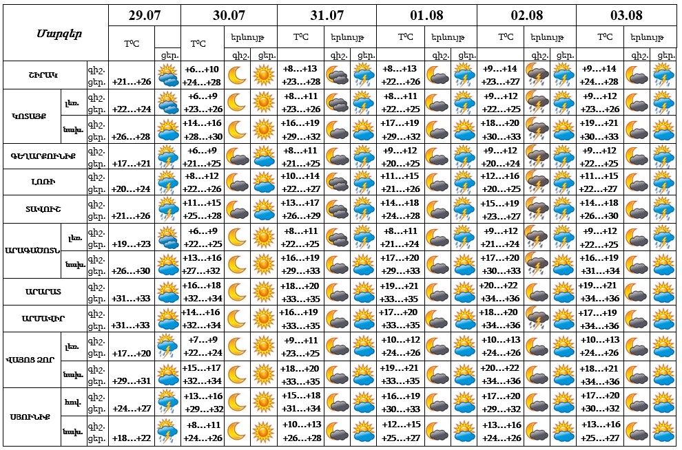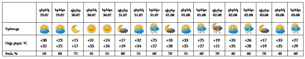 Հուլիսի 29-ի և 31-ի ցերեկը, oգոստոսի 1-3-ին առանձին շրջաններում սպասվում է կարճատև անձրև և ամպրոպ։ Հուլիսի 30-ին, 31-ի գիշերը սպասվում է առանց տեղումների եղանակ։ Քամին՝ հարավարևմտյան՝ 2-5մ/վ, ամպրոպի ժամանակ սպասվում է քամու ուժգնացում` 18-23մ/վ արագությամբ: Երեկոյան ժամերին Արմավիրում, Կոտայքի և Արագածոտնի նախալեռներում սպասվում է քամու ուժգնացում՝ 17-20մ/վ արագությամբ։ Օդի ջերմաստիճանը հուլիսի 30-ի ցերեկը, 31-ին աստիճանաբար կբարձրանա 3-5 աստիճանով։