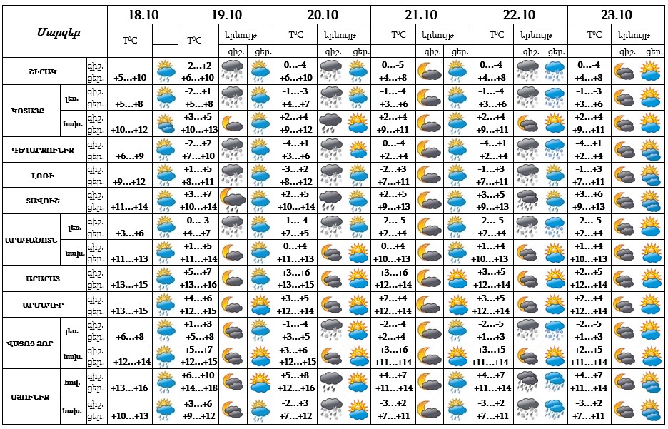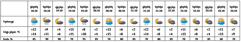 Հոկտեմբերի 18-ին և 19-ին, 21-22-ին ցերեկը սպասվում է կարճատև անձրև։ Հոկտեմբերի 20-ին և 23-ին սպասվում է առանց տեղումների եղանակ։