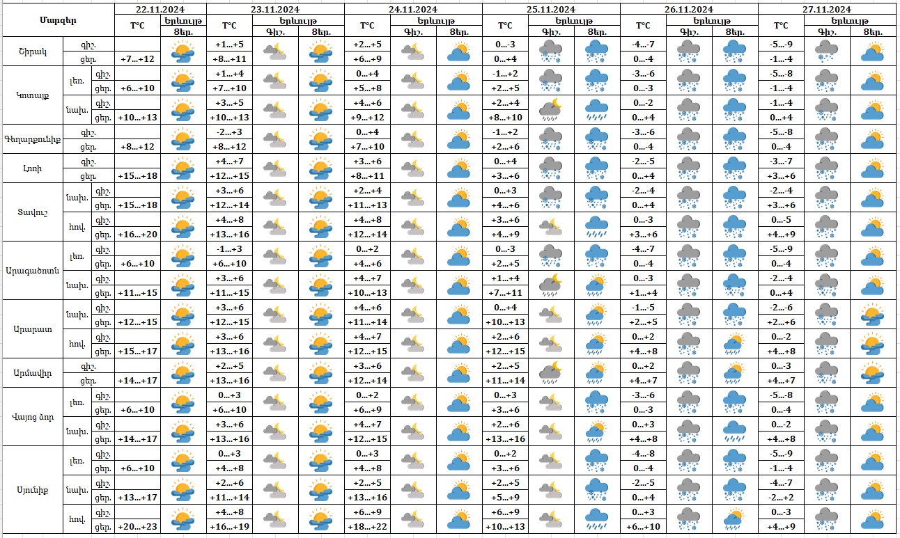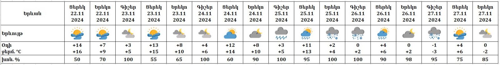 Նոյեմբերի 22-ի ցերեկը, 23-24-ին, 27-ի ցերեկը սպասվում է առանց տեղումների եղանակ։ Նոյեմբերի 25-26-ին, 27-ի գիշերը սպասվում են տեղումներ։