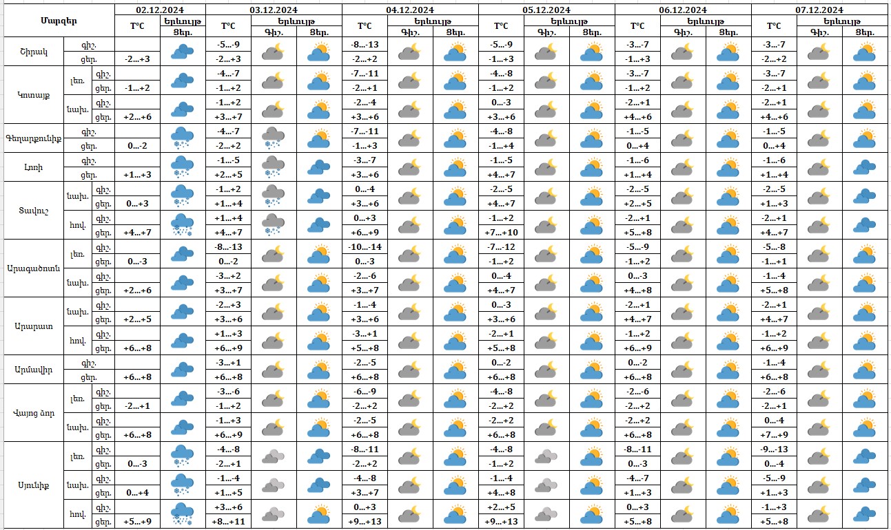 Դեկտեմբերի 2-ի ցերեկը, 3-7-ին սպասվում է առանց տեղումների եղանակ։