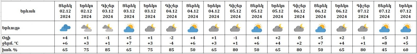 Դեկտեմբերի 2-ի ցերեկը, 3-ի գիշերն առանձին շրջաններում սպասվում են թույլ տեղումներ։ Դեկտեմբերի 3-ի ցերեկը, 4-7-ին սպասվում է առանց տեղումների եղանակ։