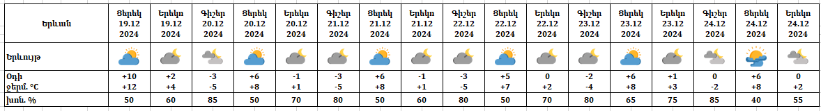 Դեկտեմբերի 19-ի ցերեկը, 20-24-ին սպասվում է առանց տեղումների եղանակ։ Քամին արևմտյան 3-6մ/վ, դեկտեմբերի 19-ի ցերեկը սպասվում է քամու ուժգնացում՝ 15-18մ/վ արագությամբ։