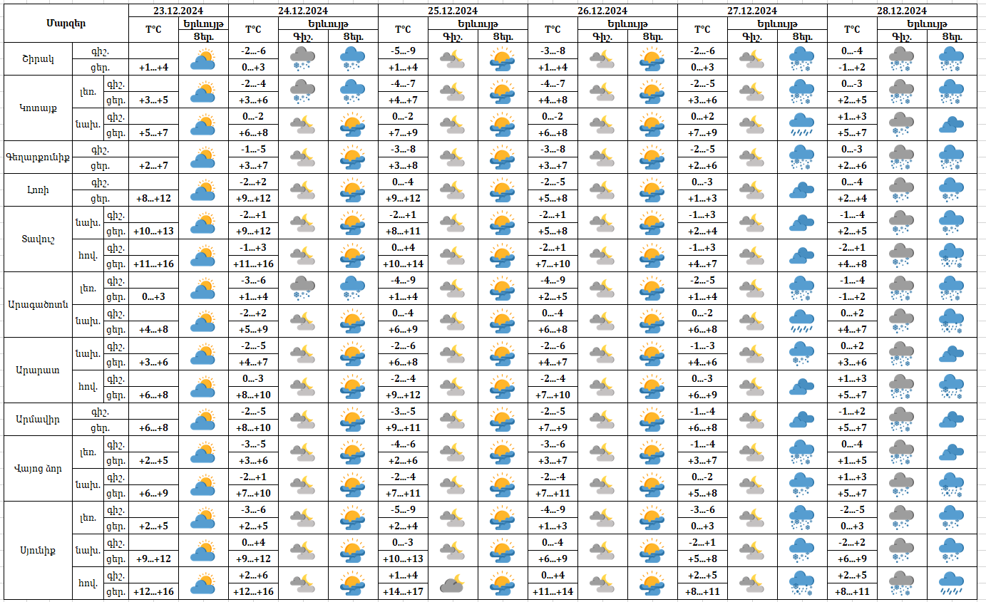 Դեկտեմբերի 23-ի ցերեկը, 25-26-ին սպասվում է առանց տեղումների եղանակ։ Դեկտեմբերի 24-ին առանձին շրջաններում սպասվում է թույլ ձյուն, դեկտեմբերի 27-ի ցերեկը, 28-ին շրջանների զգալի մասում սպասվում են տեղումներ, լեռնային շրջաններում ձյան, նախալեռնային շրջաններում ձնախառն անձրևի տեսքով։ Քամին արևմտյան 2-4մ/վ։ Օդի ջերմաստիճանն էապես չի փոխվի։