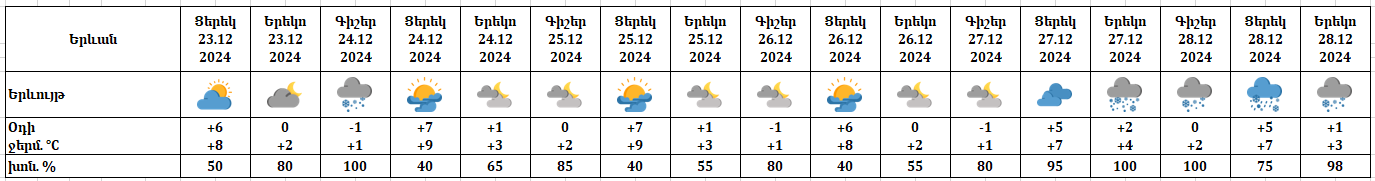 Դեկտեմբերի 23-ի ցերեկը, 25-26-ին սպասվում է առանց տեղումների եղանակ։ Դեկտեմբերի 24-ի գիշերը և առավոտյան հնարավոր է թույլ ձյուն, 27-ի ցերեկը, 28-ին սպասվում են տեղումներ։