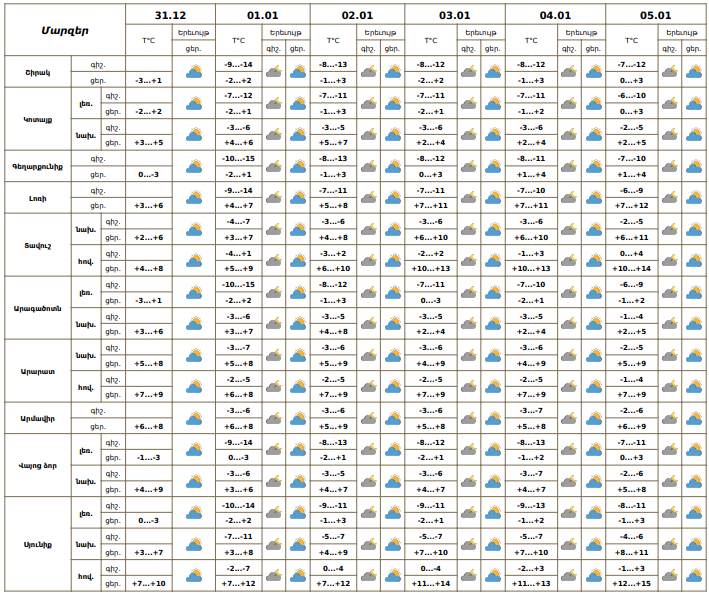 Դեկտեմբերի 31-ի ցերեկը, հունվարի 1-5-ին սպասվում է առանց տեղումների եղանակ։ Ցածրադիր գոտում առավոտյան ժամերին սպասվում է մառախուղ։