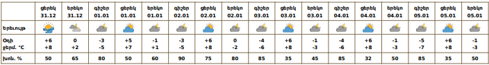 Դեկտեմբերի 31-ի ցերեկը, հունվարի 1-5-ին սպասվում է առանց տեղումների եղանակ։ Արարատյան դաշտում առավոտյան ժամերին սպասվում է մառախուղ, ճանապարհներին՝ մերկասառույց։ Քամին հյուսիսարևմտյան 2-4մ/վ։ Օդի ջերմաստիճանն էապես չի փոխվի։