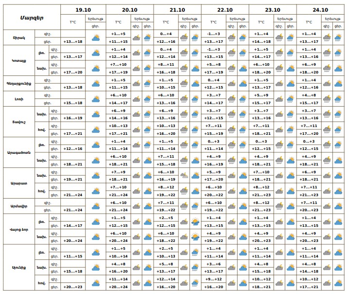 Հոկտեմբերի 19-ի ցերեկը, 20-ի գիշերը սպասվում է առանց տեղումների եղանակ։ Հոկտեմբերի 20-ին կեսօրից հետո, 21-24-ին առանձին շրջաններում սպասվում է կարճատև անձրև։ Քամին արևմտյան՝ 2-5մ/վ, հոկտեմբերի 21-ին առանձին շրջաններում հնարավոր է քամու ուժգնացում՝ 16-19 մ/վ արագությամբ։ Օդի ջերմաստիճանը հոկտեմբերի 20-21-ին գիշերը կբարձրանա 4-5 աստիճանով։